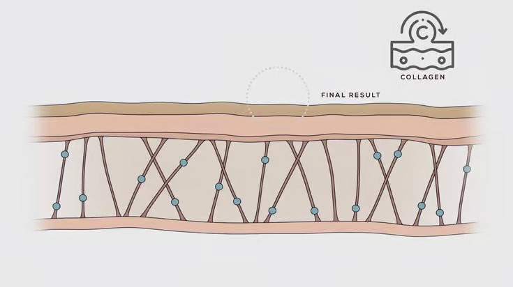 Collagen generates for the next 6-8 weeks. The result is improved skin texture, wrinkles are reduced and skin is smoother.